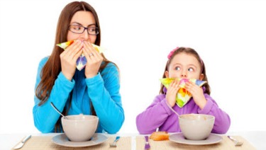 manners. By age four, he or she will no longer grip the fork or spoon in his or her fist and be able to hold them like an adult. With your help, he or she can begin learning the proper use of a table knife. You can also teach other table manners, such as not talking with a full mouth, using a napkin, and not reaching across another person's plate. While it's necessary to explain these rules, it's much more important to model them. Your child will watch to see how the rest of the family is behaving and follow their lead. It's easier to develop table manners if you have a family custom of eating together. Make at least one meal a day a special and pleasant family time. Have your child set the table or help in some other way in preparing the meal.