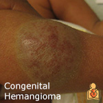 Congenital hemangiomas are present at birth. Sometimes, they can be seen during prenatal ultrasound exams. They are different from infantile hemangiomas and much rarer. This type of hemangioma does not grow after the baby is born. Congenital hemangioma often look like a large round or oval bump or mass. They tend to be purple to blue, but may also have tiny red blood vessels on the surface and a white ring around the base.
