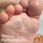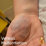 Venous malformations are tangles of veins in the skin that did not form properly during development. The veins give these birthmarks a blue or purple color. They are present at birth but may not become obvious until the teenage years. The veins can become larger with activity or certain positions, and they may become painful. Venous malformations are rare, affecting around 2 in 10,000 children.