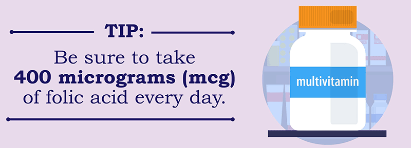 folic acid per day, starting at least one month before becoming pregnant and continuing throughout the pregnancy. This helps prevent serious defects in the baby's brain and spine.