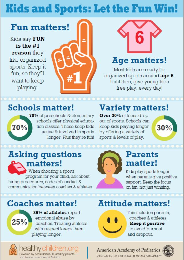 We encourage families to take a positive attitude toward sports that focuses on fun, teamwork and regular exercise. This way, sports can become part of a balanced lifestyle that keeps kids active and healthy into adulthood.