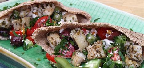 To prepare the salad: Put all the ingredients except the oil in a mixing bowl and mix well. Drizzle with the olive oil. Top the fish and pita bread with the salad mixture.