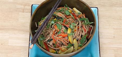 Put 2 tablespoons of olive oil in a pan over medium heat. Place the onions, ginger, and garlic in the pan and cook for 3 to 4 minutes, stirring occasionally. Add the sliced meat to the pan and cook for 6 to 7 minutes or until the meat is almost cooked. Add the vegetables to the pan followed by the soy sauce and honey, and cook for 2 minutes. Last, add the cooked noodles to the pan and mix all of the ingredients well. Cook for another 2 to 3 minutes and then serve.
