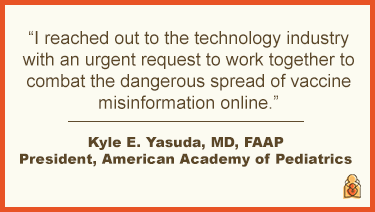“Pediatricians are working in our clinics and our communities, talking with families one-on-one about how important vaccines are to protect their children’s health. But it’s no longer enough,” said Dr. Yasuda. “Our worst fears are being realized as measles outbreaks spread across the country. I reached out to the technology industry with an urgent request to work together to combat the dangerous spread of vaccine misinformation online.”