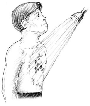 The photo shows a 6 inch (15 cm) wide area of mild redness without blistering on the forearm. This thermal burn was caused by spilled hot water.