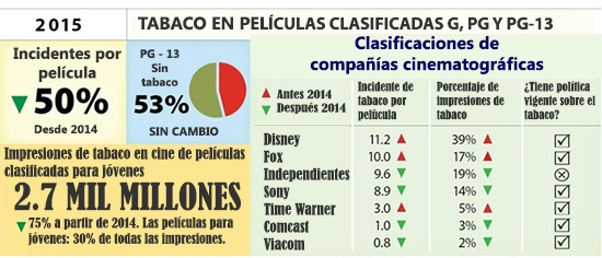 En el 2016, 26 % de todas las películas clasificadas para jóvenes (G, PG, PG-13) contenían impresiones (imágenes) de tabaco.