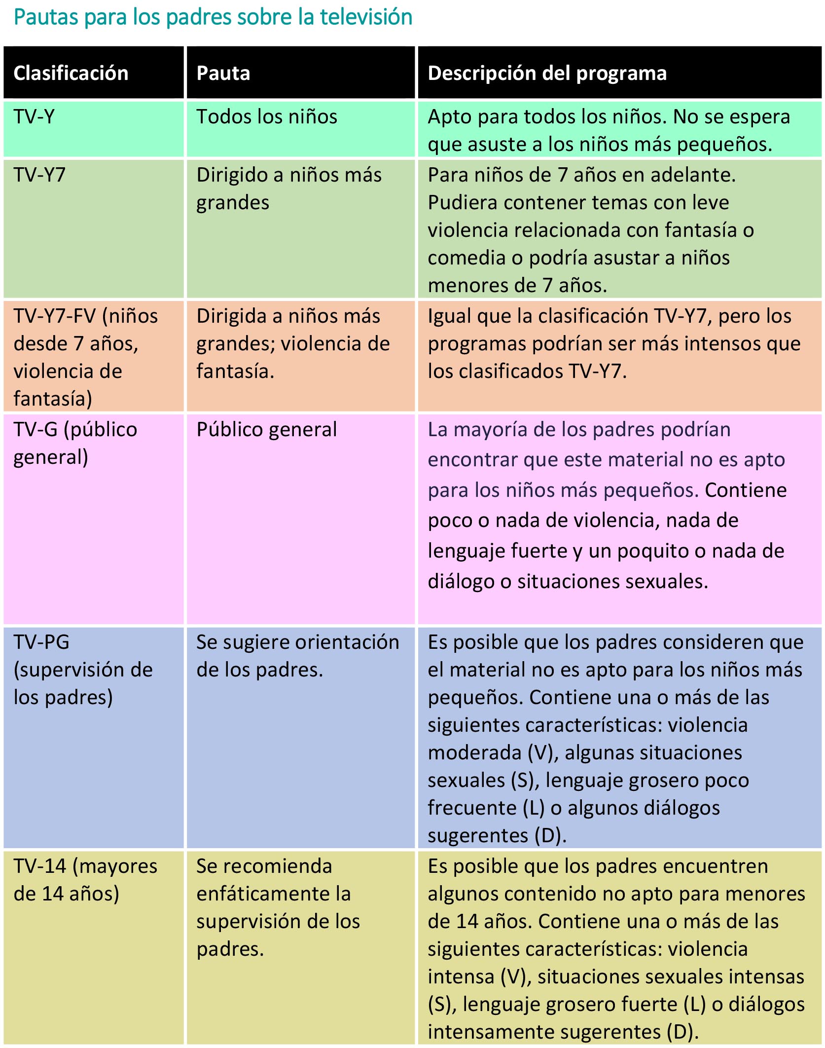 Las Pautas sobre la televisión para los padres (consultar la tabla a continuación) suelen estar incluidas en los listados de televisión locales. Recuerde que las clasificaciones no se utilizan para los programas de noticias. La AAP recomienda mantener a los niños pequeños alejados de las imágenes gráficas y sonidos repetitivos que podrían aparecer en programas de noticias, en especial después de una tragedia grave. En el caso de niños mayores, si desea que vean las noticias, grábelas con anticipación. Esto le permitirá verlas antes y evaluar el contenido antes de sentarse con ellos a mirarlas. Luego, a medida que las miran juntos, usted puede pausarlas y hablar al respecto cuando sea necesario.
