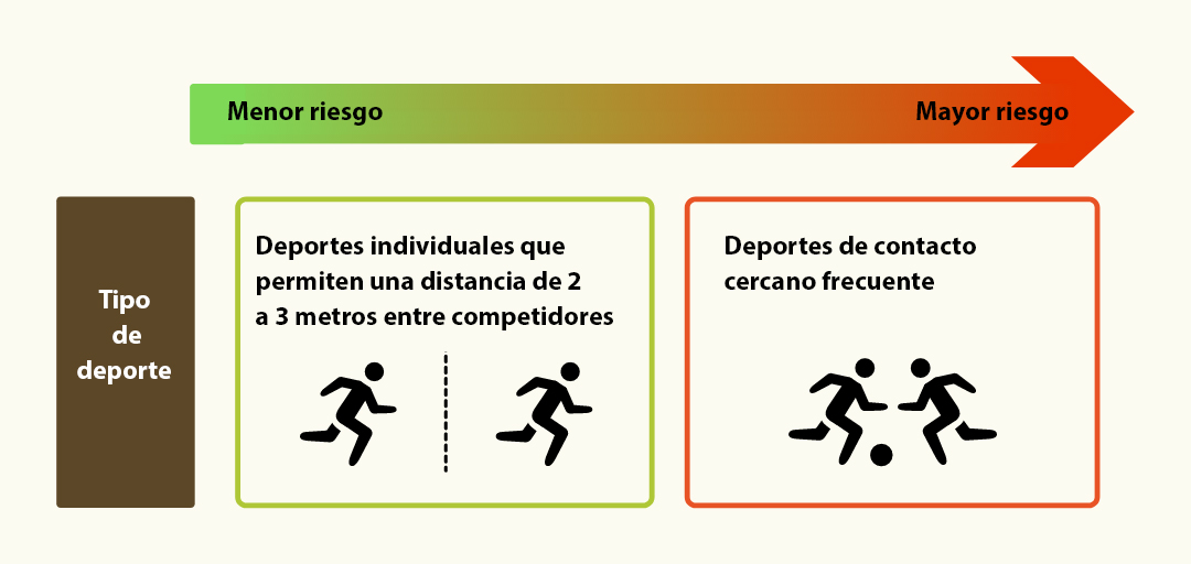 Los deportes y las actividades físicas con exposición mínima a otros jugadores podrían ser una opción más segura. Una competencia en una carrera de pista, por ejemplo, puede tener menos riesgo que los deportes donde alguien está en contacto cercano con otro jugador por un periodo largo de tiempo, como en el caso de medio partido.