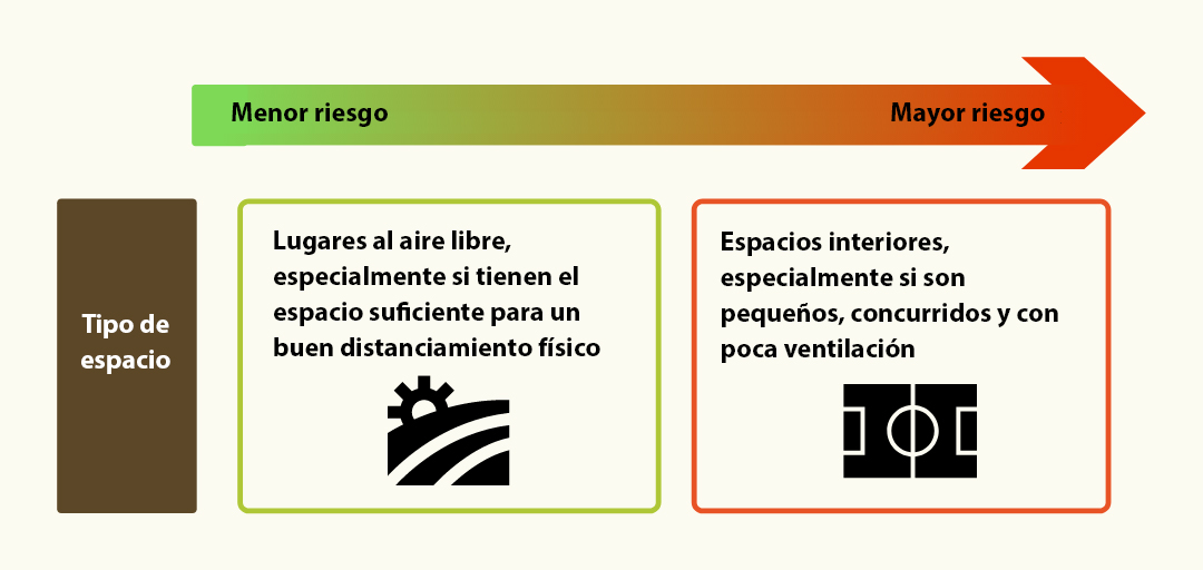 Donde los atletas entrenan, practican y compiten también afecta el riesgo. Es más probable que el COVID-19 se propague en espacios interiores cerrados con poca ventilación. Los deportes y las actividades en espacios interiores probablemente tienen más riesgo,según la evidencia, especialmente la lucha libre y el hockey sobre hielo. Elija participar en deportes y clases al aire libre siempre que sea posible.