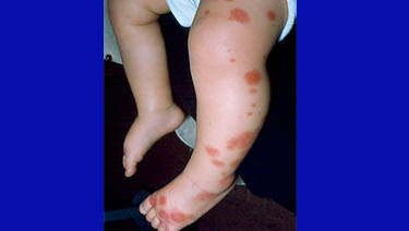 Casi todos los niños diagnosticados con la púrpura de Schöenlein-Henoch tienen un sarpullido indoloro. Generalmente comienza con ronchas protuberantes, manchas rojizas y pequeños puntos rojos (petequias) alrededor de los pies y los tobillos. El sarpullido también puede aparecer en las piernas y las nalgas. En los niños más pequeños, especialmente en aquellos que todavía no caminan, frecuentemente el sarpullido se observa en los brazos, el tronco y la cara. Habitualmente, desaparece en aproximadamente 10 días.