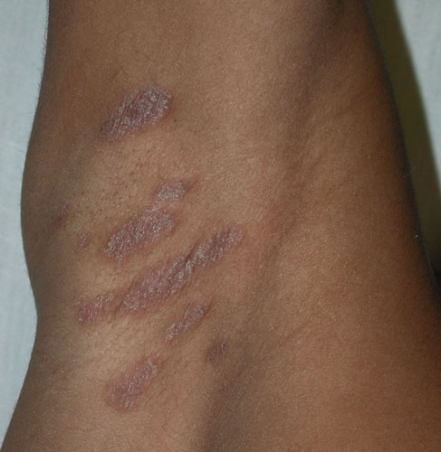 La psoriasis en placas es el tipo más común de psoriasis. Se trata de manchas rojizas o violáceas, gruesas o finas, con escamas blancas adheridas. Estas manchas son más comunes en los codos y las rodillas y, a veces, en el cuero cabelludo, pero pueden aparecer en cualquier parte del cuerpo.