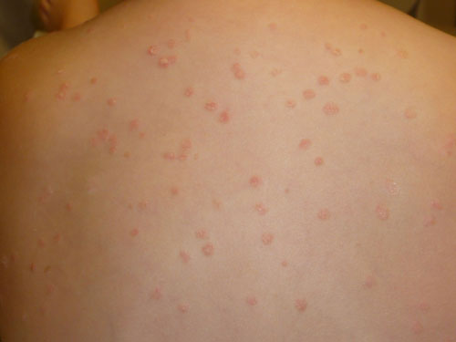 se ve como pequeñas manchas en forma de gota de lluvia con un poco de descamación blanca en la parte superior. Este patrón de psoriasis a veces se observa después de una amigdalitis estreptocócica u otras infecciones menores. | |