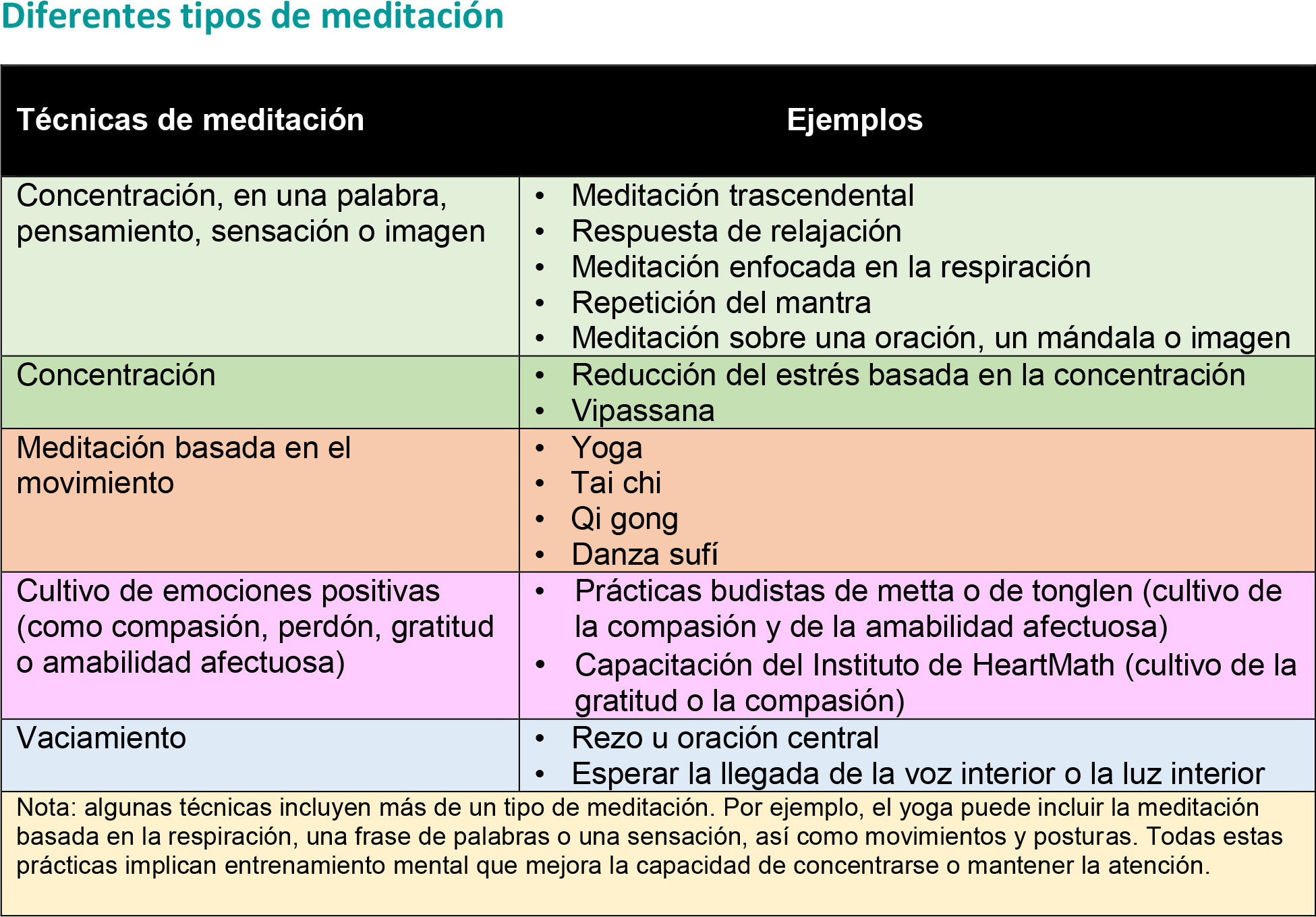Las técnicas más comunes de prácticas de meditación son formas para logar concentración, conciencia plena, meditaciones en movimiento, emociones positivas y vaciamiento de la mente. Hay ejemplos y maneras específicos para practicar cada una de estas técnicas. Consulte la tabla a continuación.