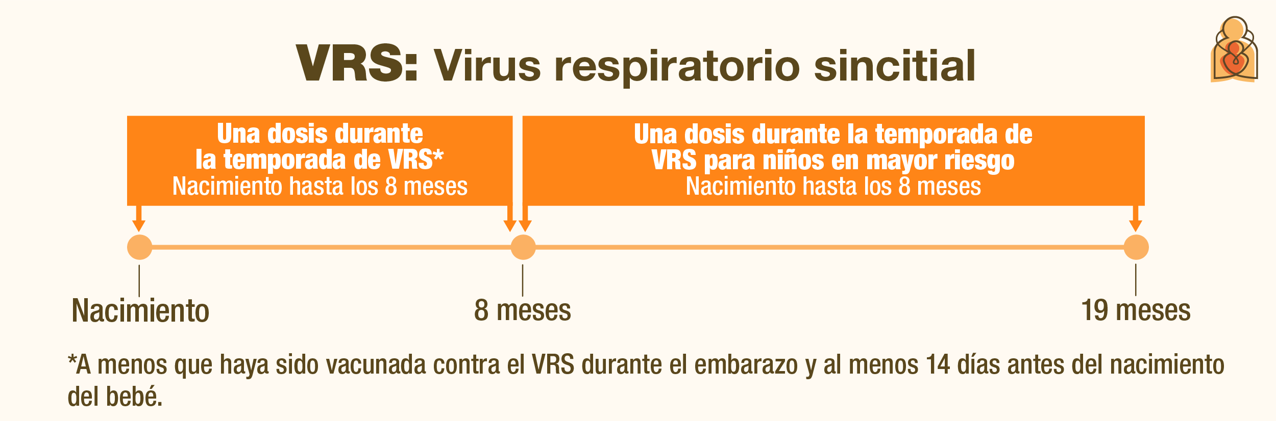 El virus respiratorio sincitial (VRS) suele ser común entre finales de otoño y principios de primavera. Este virus es la principal causa de hospitalización en bebés. Existe una vacuna contra el VRS para bebés y algunos niños pequeños. También existe una vacuna contra el VRS que las madres pueden recibir durante el embarazo. Puede recibirla entre las semanas 32 y 36 de embarazo para brindarle a su bebé anticuerpos protectores si nace justo antes o durante la temporada del VRS. Aprenda más aquí.
