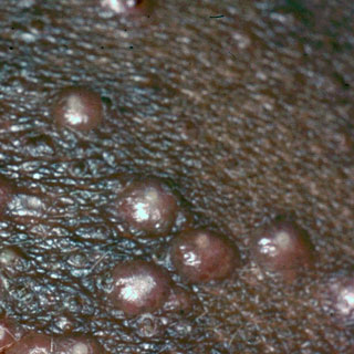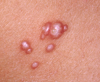 Infección viral llamada molusco contagioso (conocida a veces como verruga de agua). Las excrecencias son de color rosado, blanco o nacarado. Son firmes, pequeñas y elevadas, con un hoyuelo en el centro.