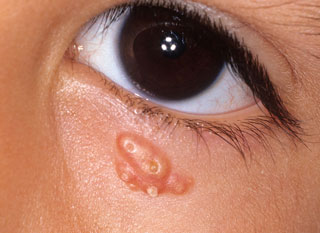 Ojo infectado con el virus del molusco contagioso. Las excrecencias son de color rosado, blanco o nacarado. Son firmes, pequeñas y elevadas, con un hoyuelo en el centro.