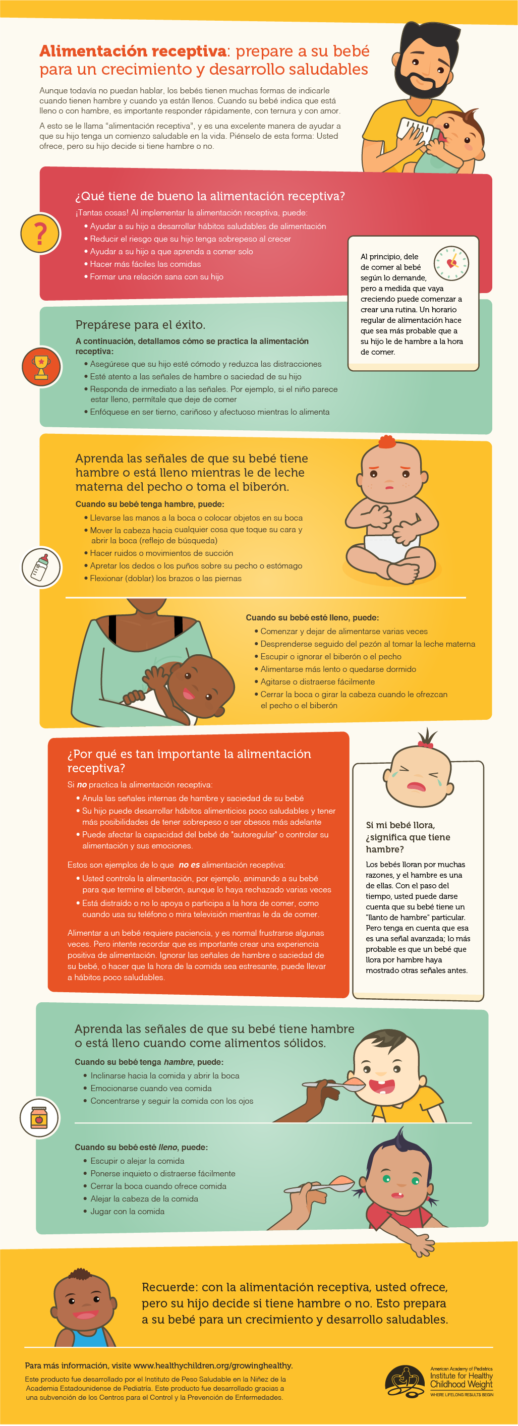 alimentación receptiva y cómo entender las señales del bebé y responder a sus necesidades cuando tiene hambre o cuando ya está lleno. Usted puede practicar estas técnicas cuando está amamantando, dando biberón o cuando le empieza a dar alimentos sólidos a su bebé.